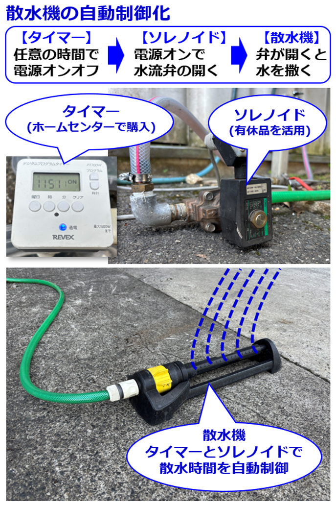 ホームセンターのタイマーと有休品のソレノイドを組み合わせて、自動散水システムを作りました。